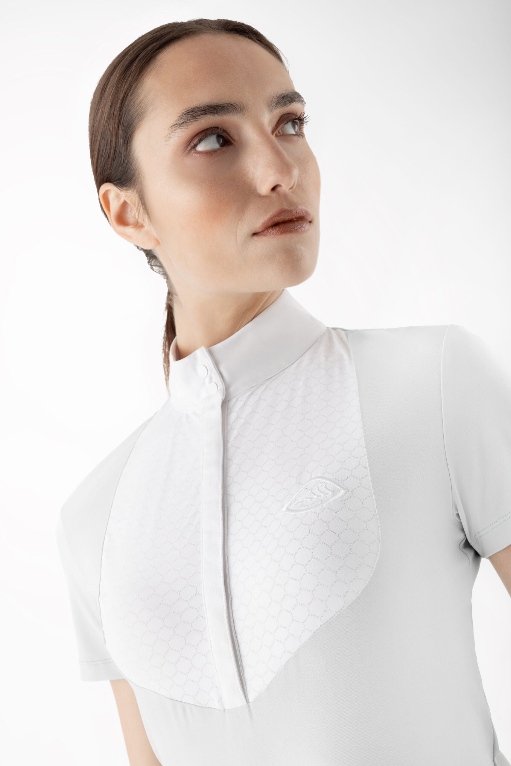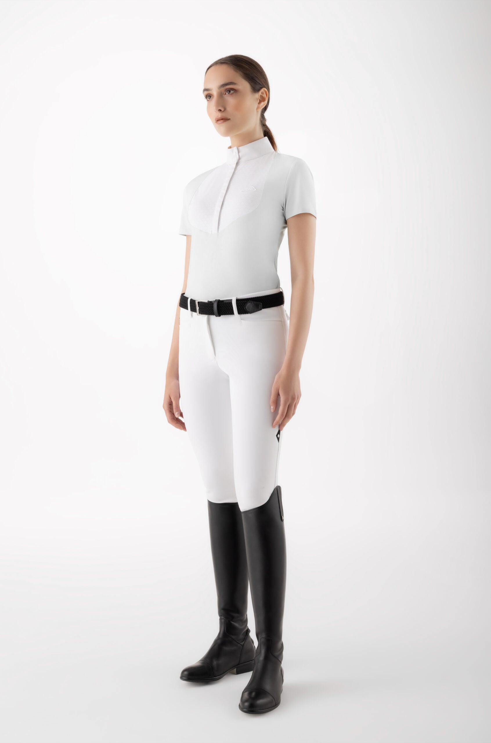 Designed for riders who demand both style and performance, this competition polo features breathable, stretch fabric with advanced cooling technology to keep you comfortable all day. Hidden flap buttons create a sleek silhouette, complemented by white snap buttons on the collar and cuffs for a polished finish. Quick-dry and UPF 30+ protection shield you from the sun, while the white printed logo on the chest adds a subtle touch of elegance.